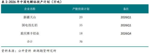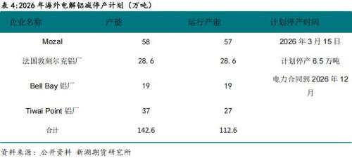 2026年海外同时存在一下减停产的可能,其中非洲Mozal电解铝厂明确2026年3月底将进入停产修整状态,因新的电力供应协议未达成。法国敦刻尔克铝厂计划2026年停产6.5万吨。澳大利亚、新西兰两家铝厂同样存在电力供应问题,不过澳大利亚的铝厂电力合同于2026年12月才到期。预计2026年海外有70万吨左右产能先后被关停。实际影响产量30-40万吨。