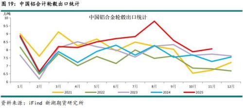 相对于铝材出口下降,铝合金轮毂出口表现强劲。不过四季度出口量受美国关税政策影响而有所下降,但仍维持较高增长。数据显示2025年11月铝合金轮毂出口量为8.06万吨,同比增10.9%。1-11月铝合金轮毂累计出口量为92.23万吨,累计同比增8.39%。海外汽车市场正经历传统燃油车与电动汽车的转换期,欧盟虽推迟燃油车销售终止期现,但这难挡电动汽车的发展大势,汽车市场总体维持较高景气状态,为铝合金轮毂消费提供较强驱动。