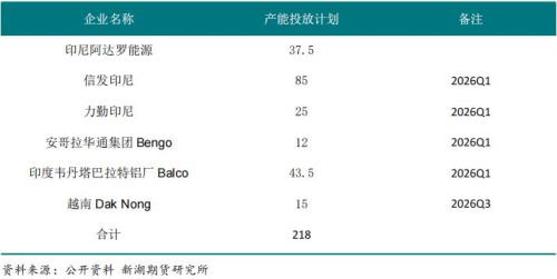 2026年将是海外新产能集中投产的一年,印度尼西亚则供需主要增量,其次为印度。其中印尼在建及建成待投产能超200万吨,部分产能已于2025年12月通电,预计2026年实现投产150万吨左右。印度韦丹塔Balco铝厂扩建项目也将供需一定增量。预计海外新投产能达200万吨左右。另外美铝西班牙铝厂及美国本土一家铝厂及2025年因电气设备故障而建产的冰岛一家铝厂均有复产的计划,涉及产能合计近50万吨。