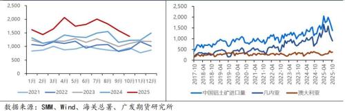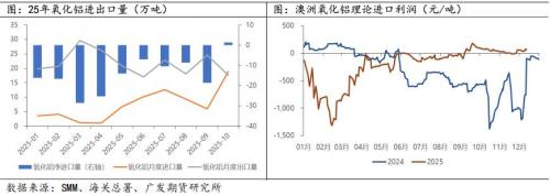 25年氧化铝净出口量明显提升,但出口对于过剩的缓解能力正在逐渐衰减。为缓解国内过剩压力,出口成为自然选择。经测算,2025年1-9月氧化铝进口窗口处于关闭状态,大部分时间氧化铝以净出口为主,根据海关数据我国1-10月净出口量约143万吨,同比去年增加133万吨,对国内的过剩局面产生一定缓解。然而,这一缓解通道的效力也正在衰减,随着海外新增产能的释放,海外氧化铝市场同样转向宽松。自2025年9月起,海外低价货源开始冲击国内市场,进口窗口打开并在10月转为净进口。这表明,中国氧化铝的出口竞争力高度依赖国内外市场价差,未来全球市场同步过剩,通过出口消化过剩量的难度也将大大增加,海外市场甚至可能阶段性反向压制国内价格。