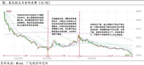 2025年前四个月,氧化铝价格呈现单边急挫的走势,从24年末近5000元/吨的高位持续下跌,4月初跌破3000元/吨的行业平均成本线,随后的一个月内盘面继续惯性下跌,最低到达2664元/吨的阶段新低。这一轮近乎腰斩的下跌,初期主要由前期高价刺激下的氧化铝供应逐步复产所驱动;进入一季度后,约460万吨新产能的集中投放加剧了供应压力,成为价格加速下破成本线的关键;随后,行业陷入普遍亏损,成本压力向上游铝土矿传导并引发原料价格松动,导致成本支撑坍塌,价格进一步惯性探底。整体而言,供应端从复产到大幅扩张的冲击是贯穿本轮下跌的主线逻辑,反观需求侧,受制于电解铝产能天花板,下游需求增长刚性且有限,市场迅速从2024年的短缺转向确定性过剩,并迫使价格围绕成本线深度调整。