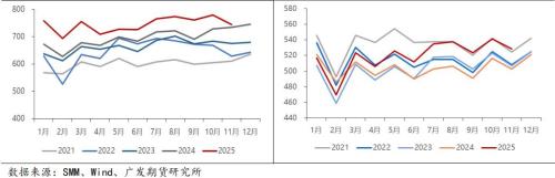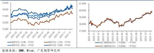 8月至11月,国内氧化铝价格整体呈现单边下跌,市场在供应过剩与成本支撑的博弈中持续寻底。具体而言,8月价格经历先稳后跌,前期因市场对反内卷政策抱有去产能预期,价格一度获得支撑,但随着预期落空及现实供应压力显现,价格重回跌势;9-10月,供应高位运行与库存不断积累驱动价格持续阴跌,价格逼近行业平均成本线并引发减产预期;11月,盘面价格击破行业平均现金成本后仅有零星减停产出现,短期未见规模性减产,全国氧化铝运行产能仍高达约9066万吨/年,同时社会总库存攀升至450万吨以上的历史高位,巨大的过剩压力使得反弹乏力,期现价格不断寻底,并打破上市以来的历史新低。