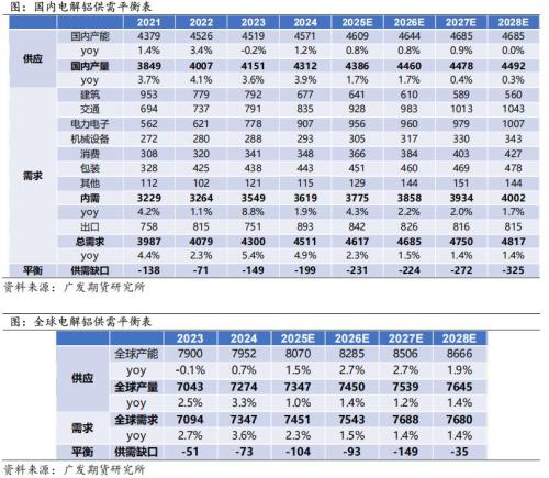 全球光伏用铝的增长逻辑将从国内驱动转向海外主导。国内市场在经历政策刺激下的高增长后将进入增速放缓的平台期,我们预计未来三年中国新增光伏装机量将出现显著回调,主要系政策刺激效应减退、电网消纳瓶颈以及行业从追求规模转向注重质量效益的反内卷调整。而未来海外市场将接力成为主要的增长引擎。欧美以及中东、印度等新兴市场,在各自能源转型政策、电价补贴或项目规划的驱动下,预计将保持15-30%的年增长。经我们测算,26-28年光伏用铝增速分别为-8%、-4%、-1%,对应用铝增量为-34、-17、-3万吨。