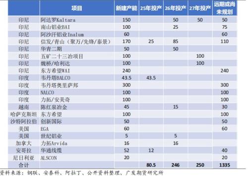 印尼崛起与“中国资本+本地资源”模式部分补充国内需求缺口。在中国产能触顶的背景下,海外产能扩张的重要性空前凸显。其中,印尼正崛起为全球最重要的电解铝新增产能集中地,这一趋势由双重逻辑驱动:一是印尼本国“禁止原矿出口、发展下游产业”的政策导向;二是中国电解铝企业为突破国内产能限制、寻求资源与成本优势的出海战略。目前,印尼在建及规划产能超650万吨,华青、阿达罗Kaltara、聚万等由中资主导或参与的项目正陆续进入建设与投产期,按照各项目原有规划,预计2026/27年印尼可贡献210/250万吨产能增量。然而,印尼铝厂的扩张也面临着较大的挑战,由于配套燃煤电厂建设周期较长(普遍需3年以上)和绿电供应不稳定的制约,或导致实际投产进度慢于规划。