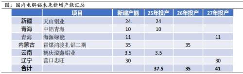国内供应逼近政策天花板,产能增长进入尾声。2025年,中国电解铝供应在政策约束下已触及增长边界,据SMM统计,截至11月底国内电解铝运行产能为4422.5万吨,行业开工率高达95%以上,距离4500万吨产能上限仅一步之遥。全年产量预计4389万吨,同比增长1.8%。这一增量主要来源于年初云南等地水电恢复带来的复产、以及24年华云、信发等少数置换项目的投产。然而,这种增长已是强弩之末。展望2026-2028年,国内已规划和确定的增量项目极为有限,主要包括内蒙古霍煤、辽宁忠旺等少数项目,其余多数项目以产能置换和技改为主,预计未来三年国内产量年化增速将放缓至1.7%、0.4%、0.3%。这意味着中国电解铝的供应弹性基本消失,国内市场的边际增量将极度稀缺。