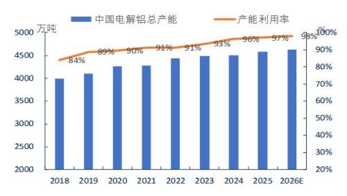 图:电解铝产能及产能利用率单位:万吨