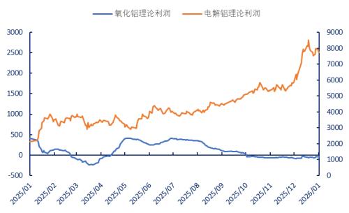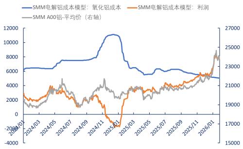 最近一年的数据将这种背离放大到极致:氧化铝期货价格下跌25%,同期电解铝期货价格则强势上涨20%。氧化铝理论利润下跌111%,电解铝理论利润上涨264%。2026年以来,这种分化趋势持续扩大。