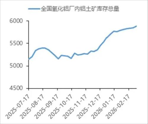 库存方面,国内铝土矿港口库存仍处于绝对高位。截至2月27日,港口库存为2116.29万吨,周环比增加212.43万吨。氧化铝厂铝土矿库存方面,受环保政策趋严的影响,当前矿石储存需严格执行密闭料仓或封闭料棚的合规要求,氧化铝厂相应控制港口铝土矿库存向堆场的转运节奏,北方地区厂内库存因此小幅回落;南方地区则因部分新增氧化铝产能投产在即,厂内库存小幅累库。据SMM数据,截至3月5日,样本氧化铝厂铝土矿库存为5891.26万吨,周环比增加41.2万吨。