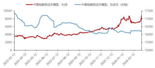 2026年2月国内电解铝行业呈现“成本微降、价格下滑、利润略有回落”的格局。据SMM数据,2月国内电解铝行业平均成本为16227.28元/吨,环比增长4.37%,同比下滑5.54%。成本分项中,氧化铝成本受行业产能过剩、库存高企影响,环比下降0.8%至5056.67元/吨,是拉低总成本的主因;电力成本则因西南地区枯水期影响,环比增长2.84%至5834.91元/吨。与此同时,受宏观情绪转冷、产业供需转弱的影响,2月电解铝平均价格环比下跌2.91%至23385元/吨。成本微增而价格回落,推动2月电解铝行业平均利润环比下滑9.72%,至7157.72元/吨。